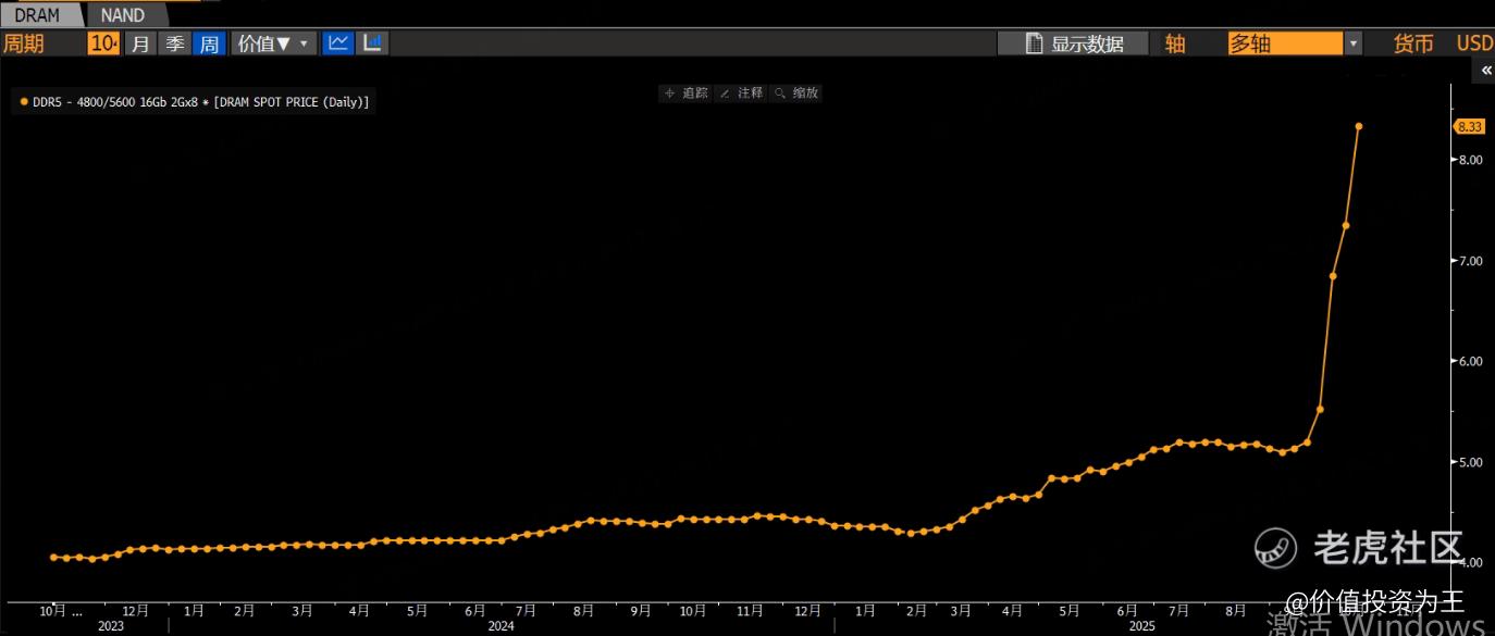 分析师纷纷上调美光目标价,主要是存储芯片价格疯涨,最新的DDR5 16GB达到8.33美元,一个月前也就5美元左右: