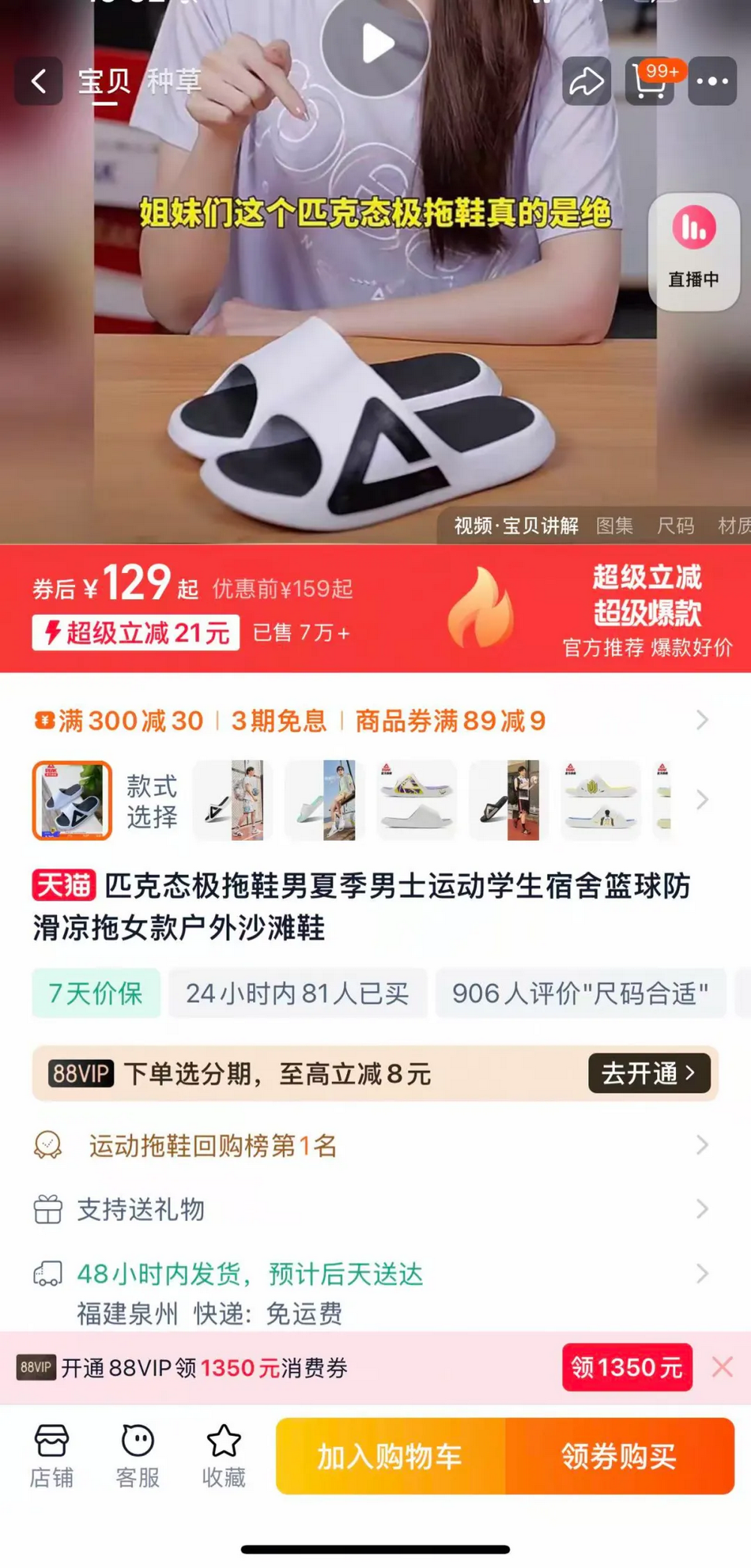 但赛道内卷背景下,各家都在强调研发和专业,匹克仅靠一个“态极”系列能力挽狂澜吗?更尴尬的一点在于,以匹克天猫旗舰店为例,其销量最好的产品是售价129元的态极拖鞋,页面显示已售出超7万件。一个运动品牌卖得最好的是上市已久的拖鞋,某种程度上也能说明其当下产品力的不足。