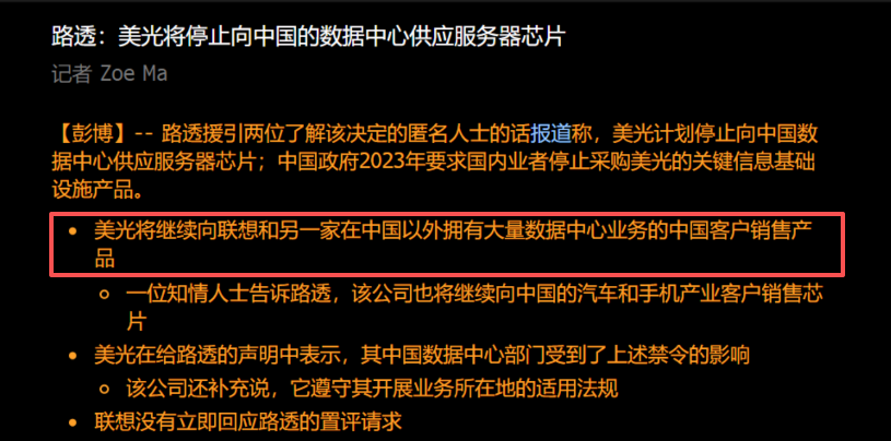 路透社最新消息:美光将停止向中国数据中心销售服务器芯片,但将继续向两家在中国以外拥有重要数据中心业务的中国客户销售产品,其中一家是联想集团。