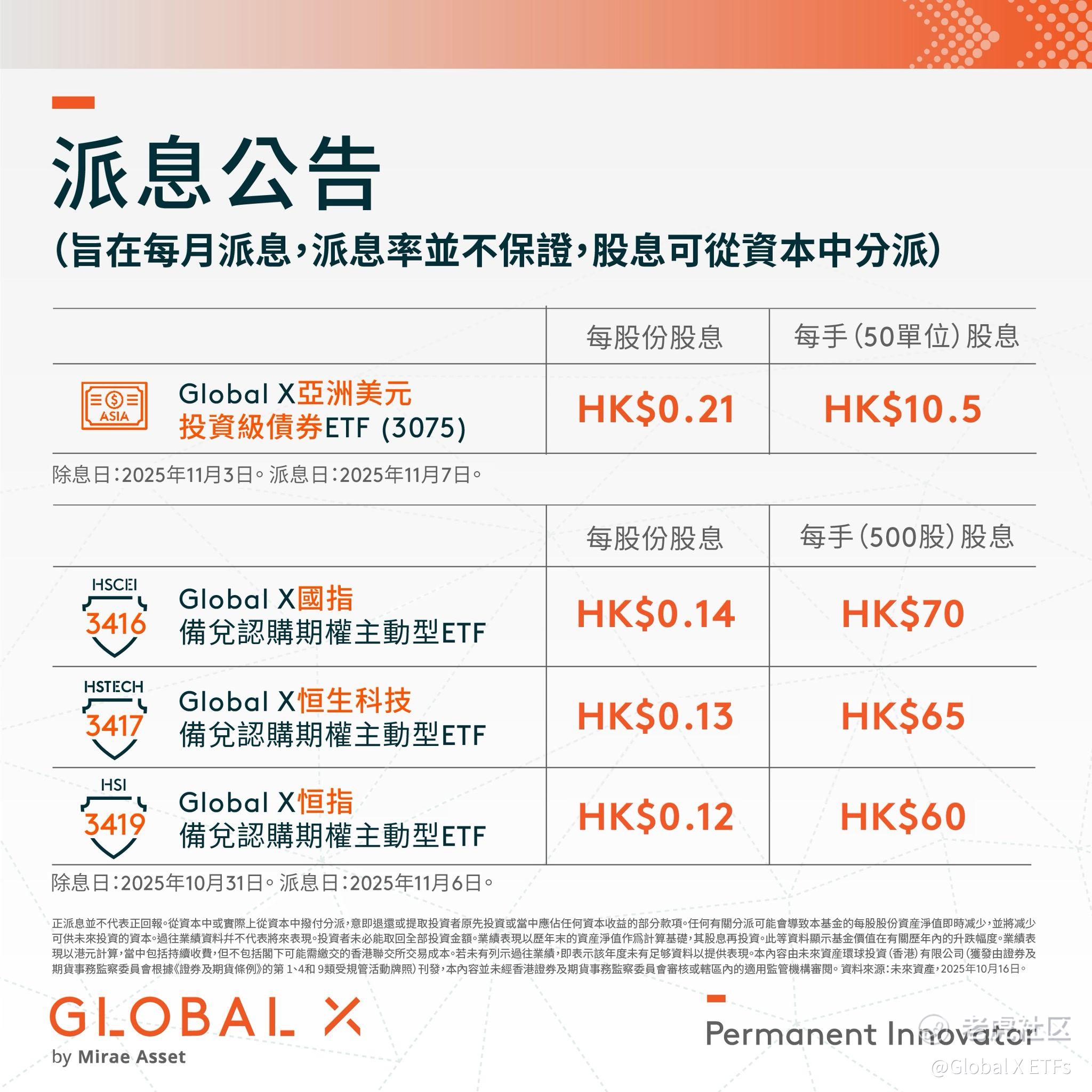 * 正派息并不代表正回报。从资本中或实际上从资本中拨付分派,意即退还或提取投资者原先投资或当中应占任何资本收益的部分款项。任何有关分派可能会导致本基金的每股股份资产净值即时减少,并将减少可供未来投资的资本。过往业绩资料幷不代表将来表现。投资者未必能取回全部投资金额。业绩表现以历年末的资产净值作为计算基础,其股息再投资。此等资料显示基金价值在有关历年内的升跌幅度。业绩表现以港元计算,当中包括持续收费,但不包括阁下可能需缴交的香港联交所交易成本。若未有列示过往业绩,即表示该年度未有足够资料以提供表现。资料来源:未来资产环球投资(香港)有限公司,2025 年 10 月 15 日。