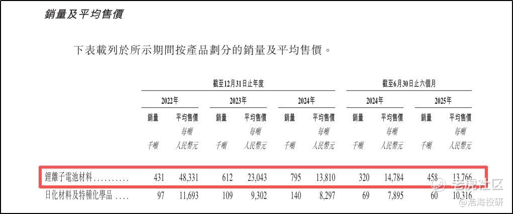招股说明书显示:自2023年以来,锂离子电池材料的价格持续下滑。2025年上半年平均售价为13766元/吨,不到2022年的1/3。