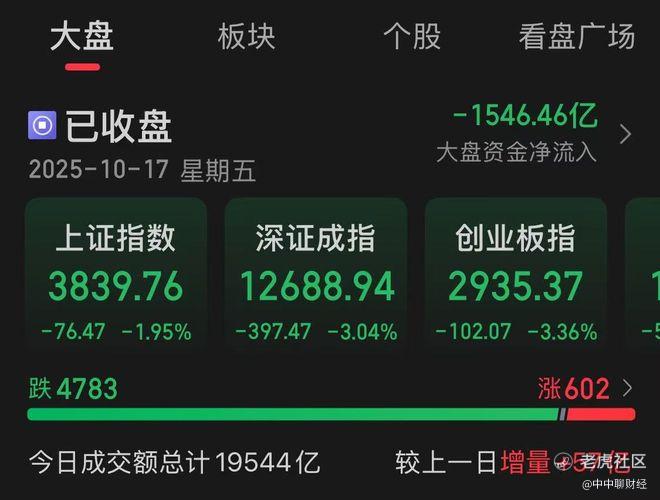 $上证指数(000001.SH)$ 10月17日,A股市场遭遇全面调整,三大指数集体大幅下挫,市场情绪显著降温。到底发生了什么?反正,回调总能找到理由,比如,美国区域银行出事、美国政府关门、贸易持续紧张的背景之下,全球投资者的信心开始出现问题。我觉得主要的原因还是,前期获利盘丰厚,资金获利了结的意愿很强,这应该是导致回调的主因。不过,不管怎样,日子还将继续,下面,我们来看一下盘面走势: