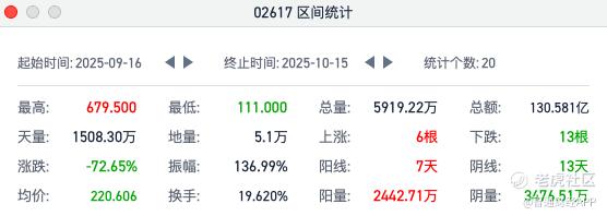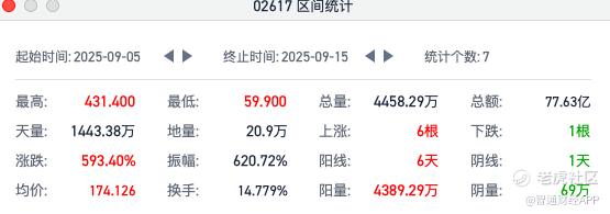 593.40%的涨幅,620.72%的振幅。在这令人瞠目结舌的数字背后,是几乎清一色的阳线(6阳对1阴)和高达14.78%的换手率。更关键的是,超过4389万的阳量,占据了总成交量的98.5%以上。