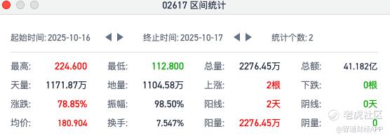 盘面显示,该股两日累计上涨78.85%,振幅高达98.50%,凸显典型的“超跌反弹”特征。量价关系方面,两日总成交量2276.45万手,换手率达7.547%,且全部为阳量,构成经典的“价升量增”反弹模式,显示底部有大资金买入并完全消化抛压。