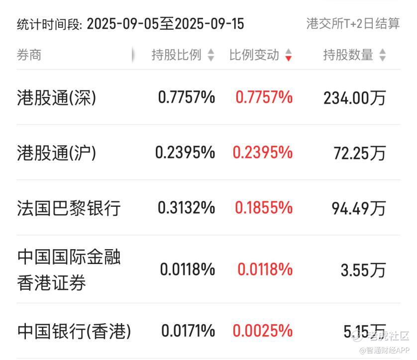 数据显示,在此次近600%的暴涨行情中,内地通过港股通南下的资金是毫无争议的做多核心引擎。两大港股通渠道在短短7个交易日内,合计增持超过306万股,新增持股比例高达1.0152%。法国巴黎银行增持0.1855%,持股量增至94.49万股,这很可能代表了部分国际游资或量化基金的跟风行为。他们敏锐地捕捉到市场出现的强劲趋势,进行右侧追涨交易。