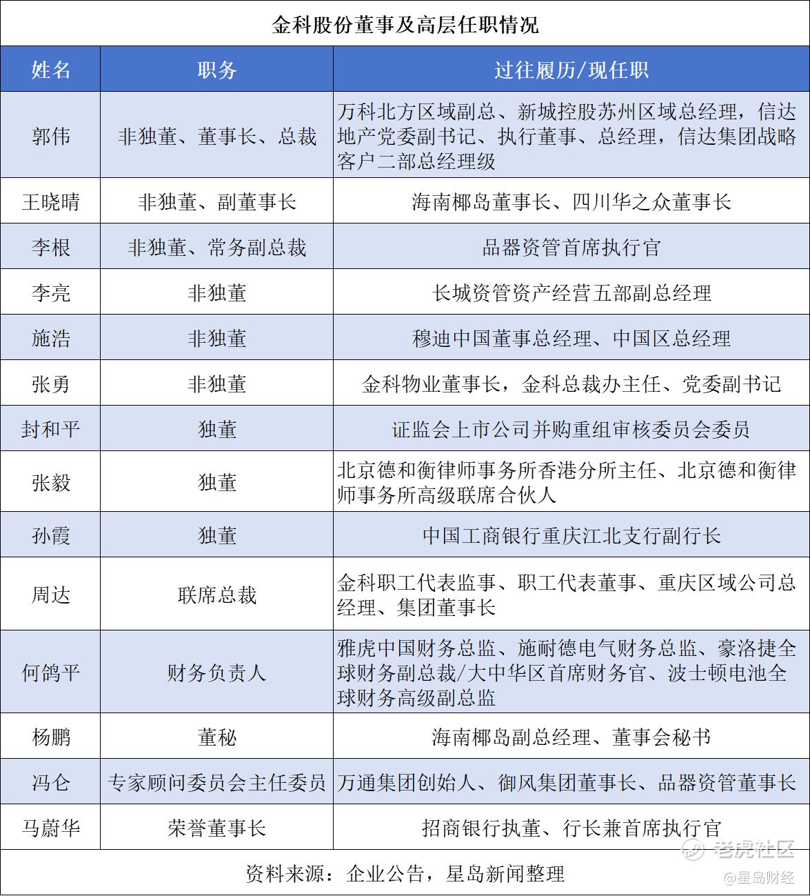 公告显示,金科股份新一届董事会涵盖资产管理、地产开发、银行、金融法律等领域的人士。其中董事长兼总裁郭伟,曾在万科、新城控股、信达地产任职;副董事长王晓晴,曾是海南椰岛集团董事长。