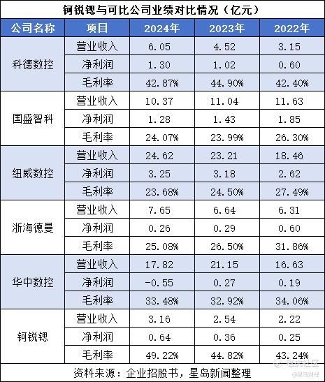 钶锐锶自称“国内全直驱数控机床的领先者”。据弗若斯特沙利文报告,该公司2024年全直驱数控机床销量在国内厂商中位列第一。不过从经营状况看,过去三年,尽管钶锐锶的毛利率水平高于同业平均,但整体销售规模仍然偏小,需进一步拓展市场。