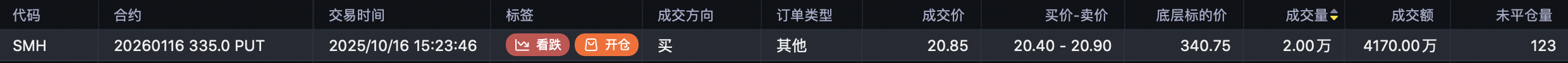半导体ETF周四成交了一张重量级做空大单,买入2026年1月16日到期335put $SMH 20260116 335.0 PUT$ 成交量2万手,成交额4170万美元
