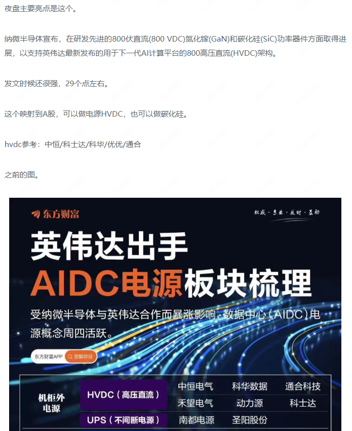 昨天的纳微消息驱动是HVDC,是英伟达最新架构中的核心变化,今天A股映射也是最强分支之一。