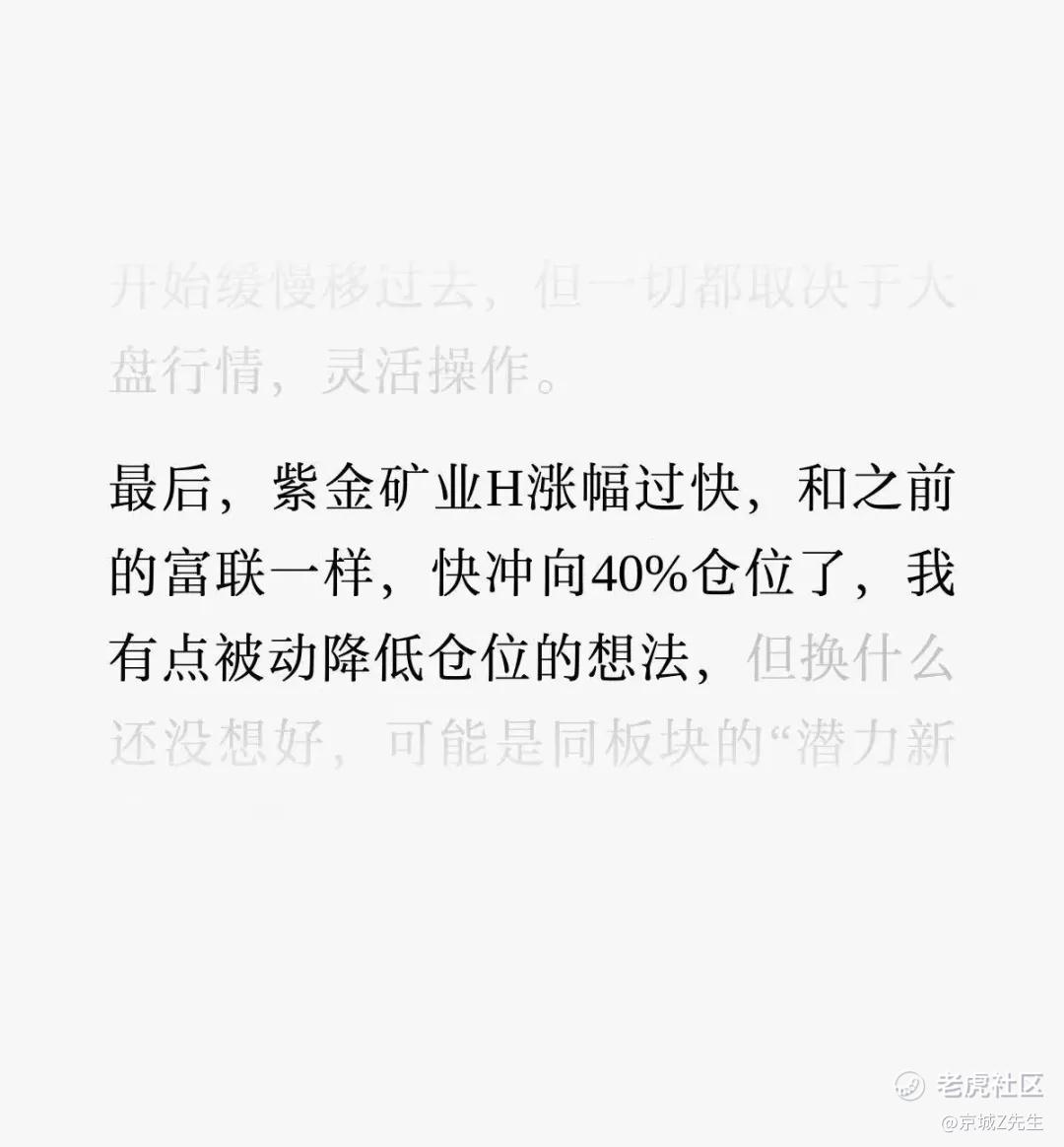 第二个原因,有点临时起意,周四的时候我观察到老铺的走势特别好,就又卖了大约三分之一换仓,也是一个短期赔率问题,之后紫金如果回调充分,可能随时换回来。