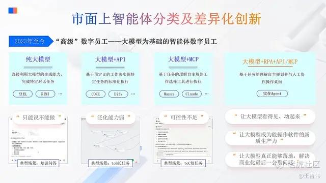 经历了2年多的发展,在科技巨头探索和开源领域努力及市场需求增长的共同作用之下,尤其是在具备深度规划能力的RPA Agent出现之后,从技术和应用角度来看,目前市面上的智能体大体可以分为四种,如下: