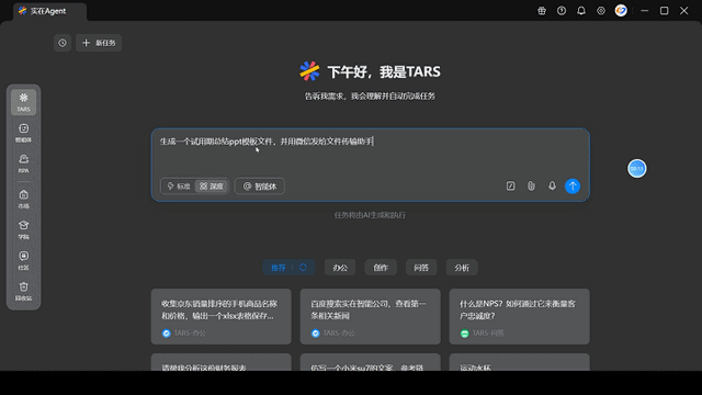 案例2:设计制作PPT模板并微信发送。输入需求指令让它制作PPT模板并发送到微信传输助手,它会主动识别任务需求,将其深度规划为3个执行步骤,先调用工具生成试用期总结PPT模板,把模板保存为本地文件,再打开微信找到文件传输助手,精准选择模版文件发送给文件传输助手。