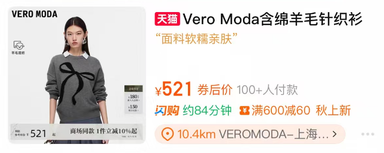 阿里电商全域超过10亿的流量也正不断滋养着淘宝闪购。继天猫品牌店私域展示闪购商品和服务后,在双11前几天,淘宝搜索和信息流里也都出现了闪购相关的产品,Veromoda、Only等品牌的多个商品都显示可以提供即配服务,为用户提供服务和价格更优的商品,也为品牌带来更大的增长空间。