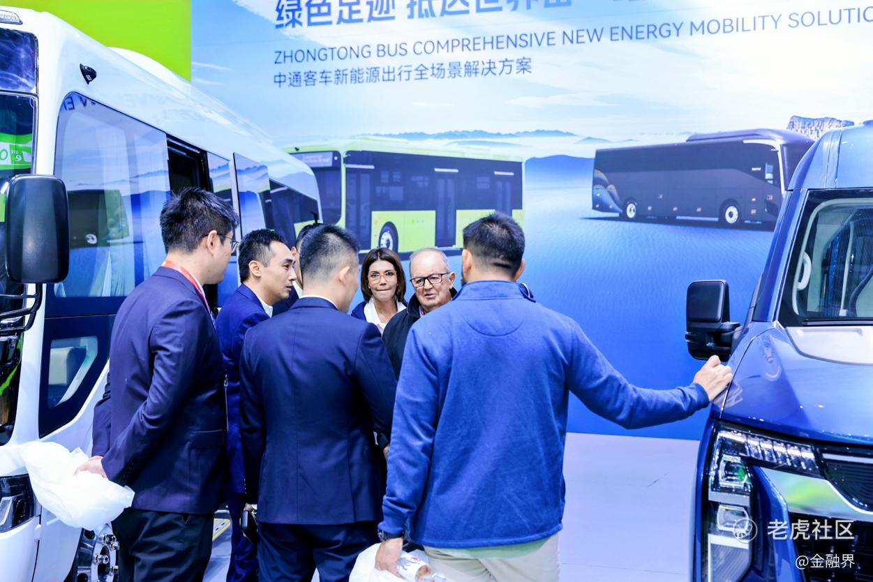 图片说明:外国客商正在新能源展区了解新能源客车产品