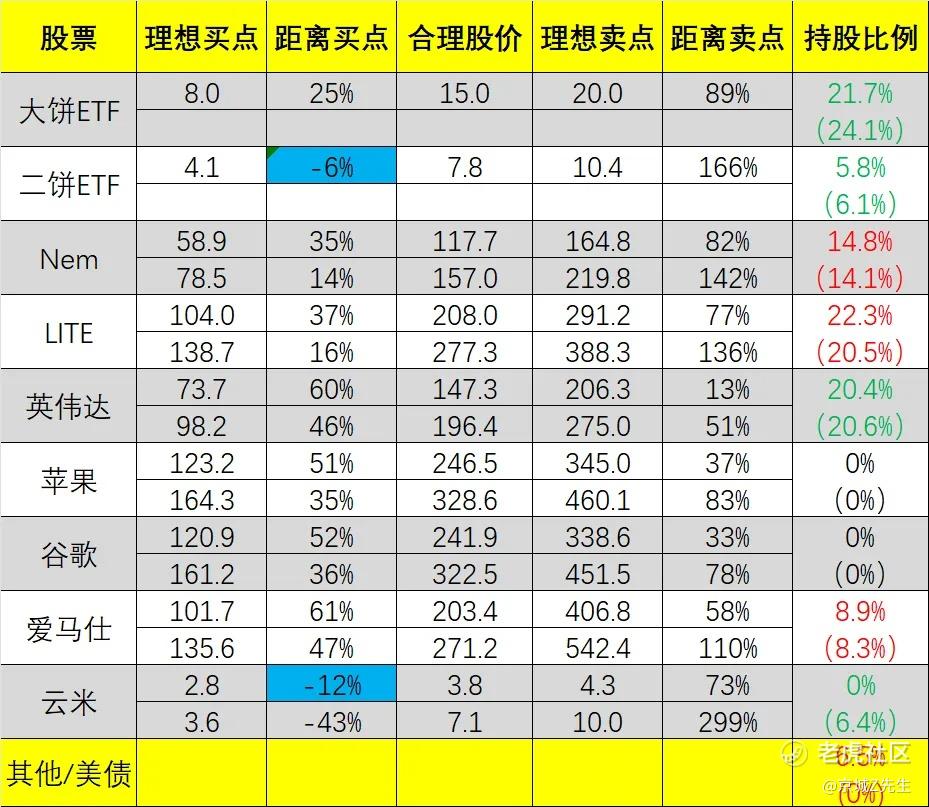 大饼ETF 21.7%,二饼ETF 5.8%,LITE 22.3%,英伟达 20.4%,爱马仕 8.9%,NEM 14.8%,现金/美债 6.5%。