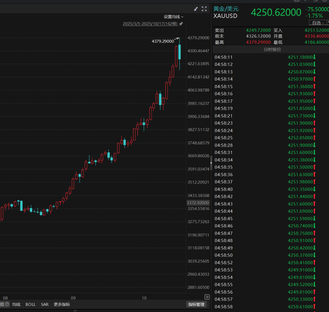 终于调整了,周五黄金跌了1.75%。