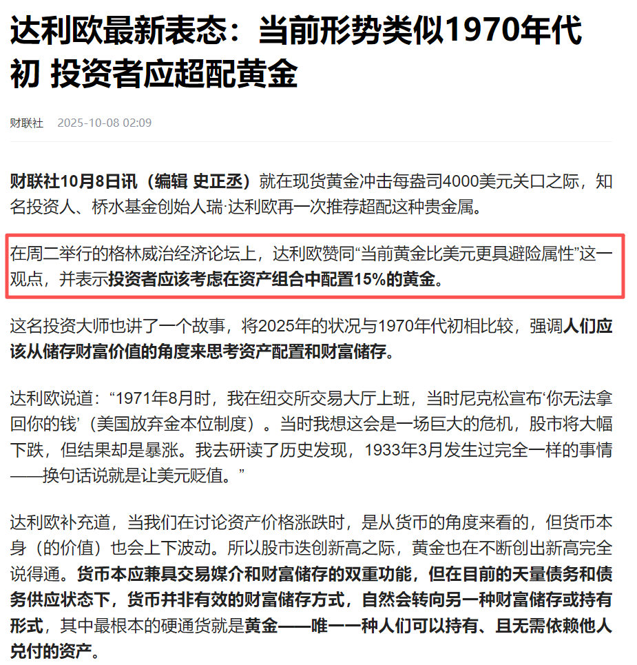 包括达利欧等欧美顶级投资人,其实还是建议增配黄金的: