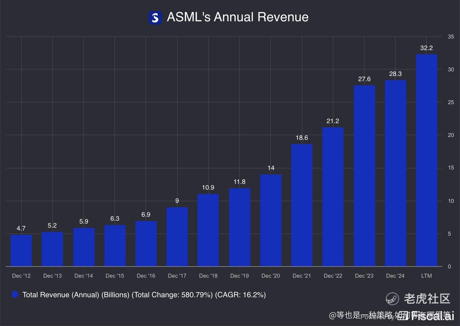 $ASML在过去四个季度带来了 322 亿美元的收入,高于 2020 年的 140 亿美元