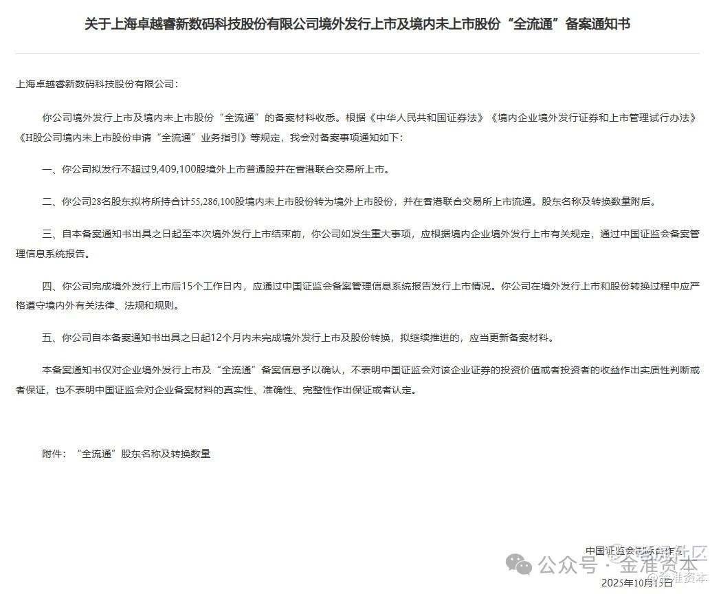5,关于上海卓越睿新数码科技股份有限公司境外发行上市及境内未上市股份“全流通”备案通知书