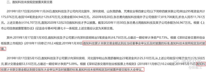 2020年12月23日,数知科技突然宣布预计将出现56亿-61亿元的商誉减值,导致股价次日跌停。调查显示,2019年至2020年期间,数知科技不仅存在信息披露违法违规,实际控制人张志勇还存在违规关联交易和证券内幕交易,最终被“采取终身市场禁入措施”。