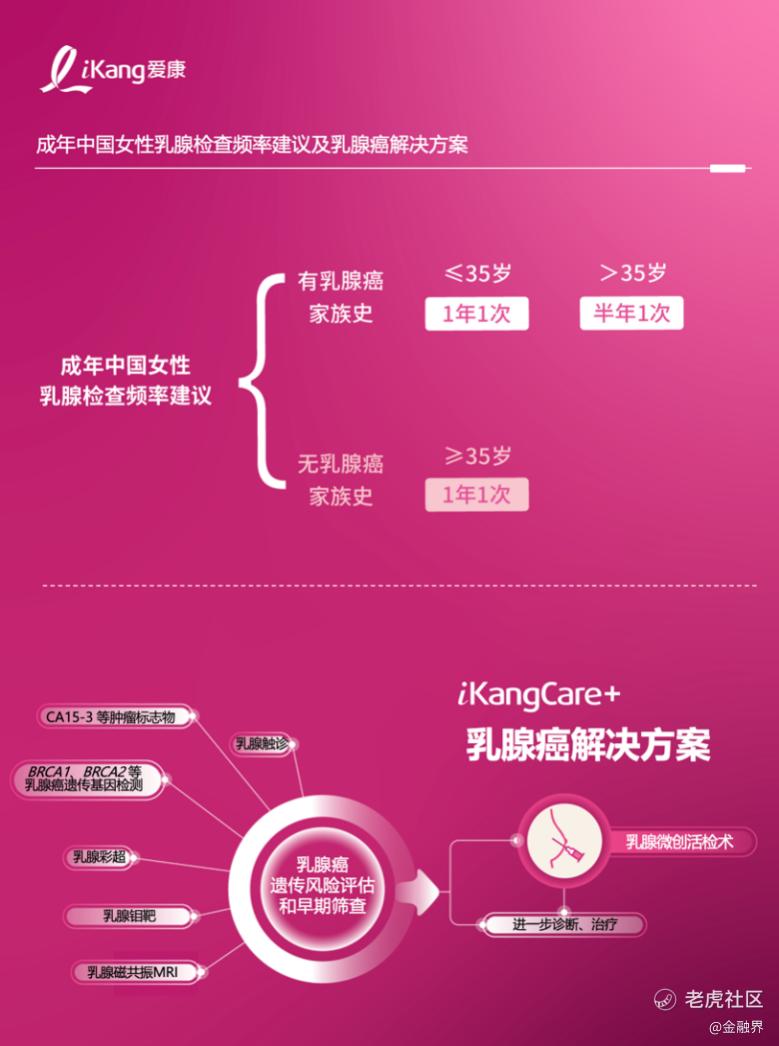 定期进行健康体检,是远离乳腺癌这一“粉红杀手”的重要措施。爱康建议:中国女性从35岁开始,乳腺检查频率建议一年一次;超过35岁且有乳腺癌家族史的女性,建议缩短到半年一次;如有BRCA基因突变的女性,则需要从18岁开始定期筛查。除触诊外,可结合乳腺超声、乳腺钼靶、乳腺磁共振MRI、肿瘤标志物等的针对性检查。