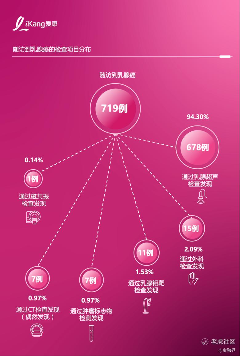 乳腺结节的普遍性反映出女性乳腺健康形势的严峻。尽管大多数乳腺结节属于良性病变,但仍有1%-2%可能发展为乳腺癌②。粉红报告显示,在298.38万位的女性体检人群中,爱康集团已随访到乳腺癌719例,后续随访工作仍在进行中,预计会有更多确诊病例被发现。