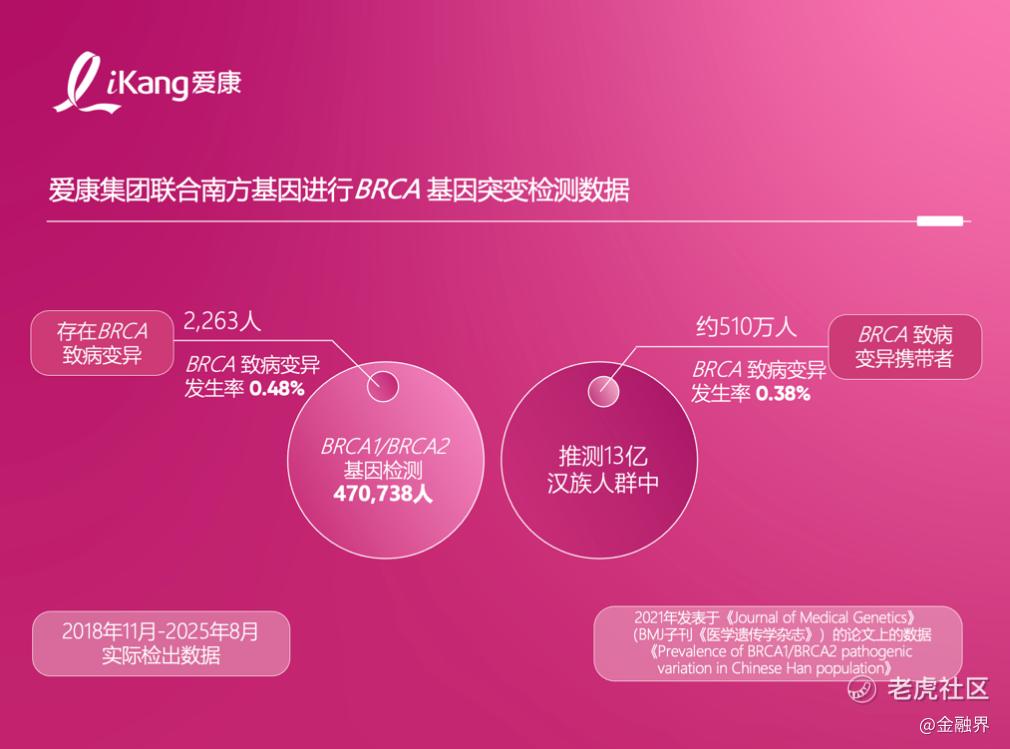 对部分女性而言,乳腺癌发病风险早已写入基因。研究发现,携带BRCA1/2基因突变的女性更易受到乳腺癌“攻击”。而通过BRCA1/2基因检测可以提前直面“天命”,提前评估自身风险并及早干预。2018年11月至2025年8月,共计有470,738位爱康用户进行了BRCA1/BRCA2基因检测,其中有2,263位用户的BRCA1/BRCA2基因存在致病变异,致病变异率为0.48%。这与上海交通大学医学院附属第一人民医院、中国科学院植物生理生态研究所、爱康集团和南方基因在2021年发表于《Journal of Medical Genetics》的论文中的数据(女性和男性)基本一致。