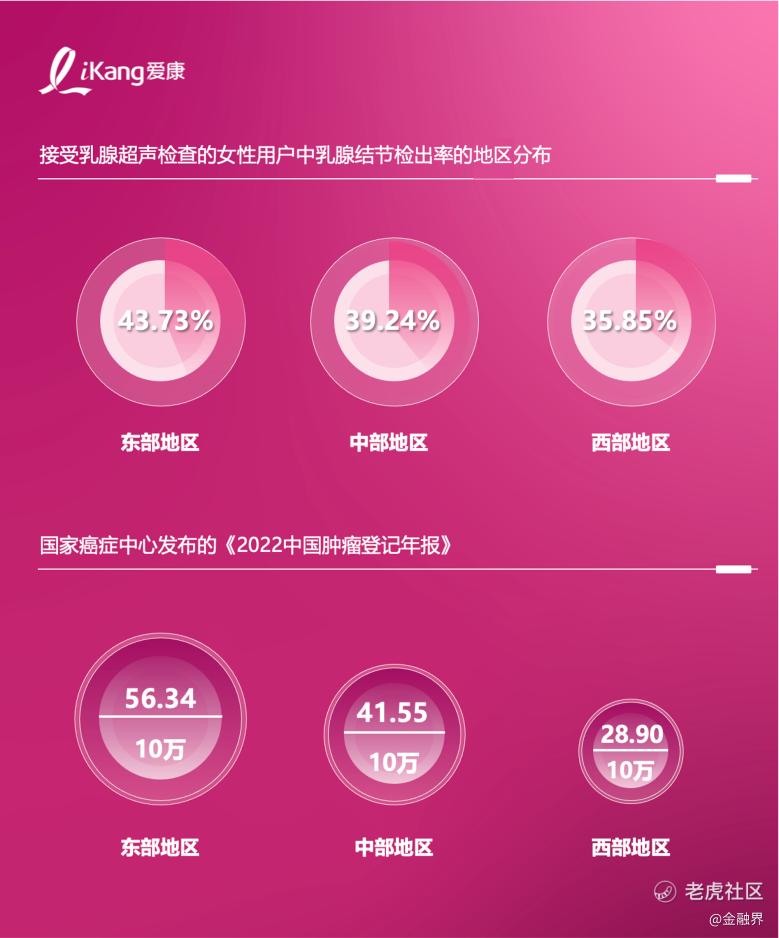 从地域分布看,经济实力和竞争压力一起“遥遥领先”的东部地区乳腺结节检出率最高,达43.73%。中部地区为39.24%,西部地区最低(35.85%),这一趋势与国家癌症中心统计的乳腺癌发病率在地理分区分布上呈正相关。