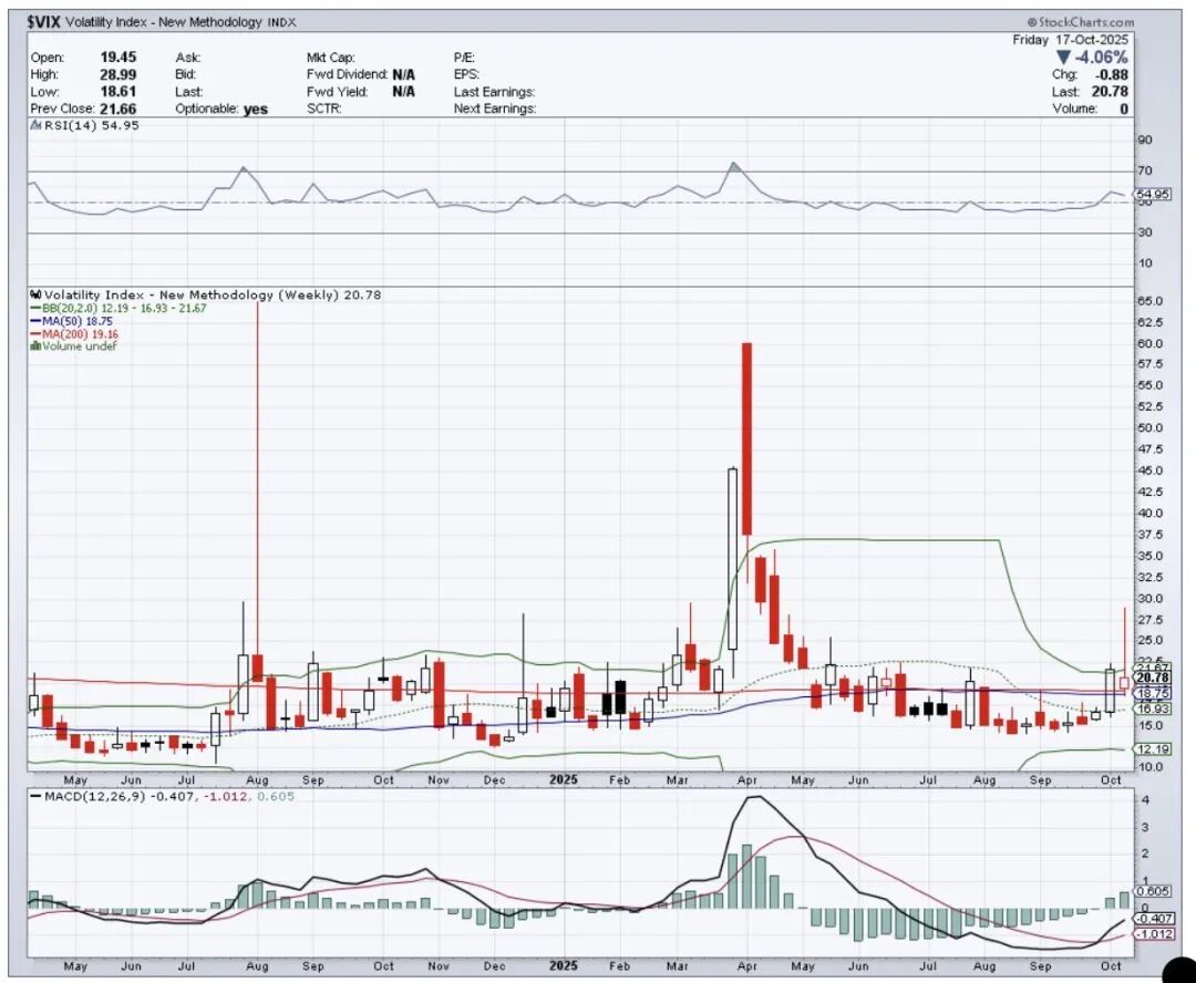 VIX周线是带特长上影红阳线。下周熊熊最好的希望是它走成孕线。