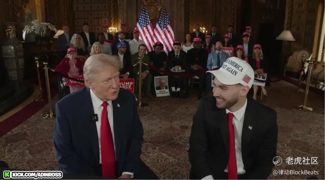 2024 年 8 月,Mar-a-Lago 的客厅,特朗普与 Adin Ross 面对面坐着。Ross 25 岁,是美国最有影响力的年轻主播之一,观众多为男性 Z 世代。