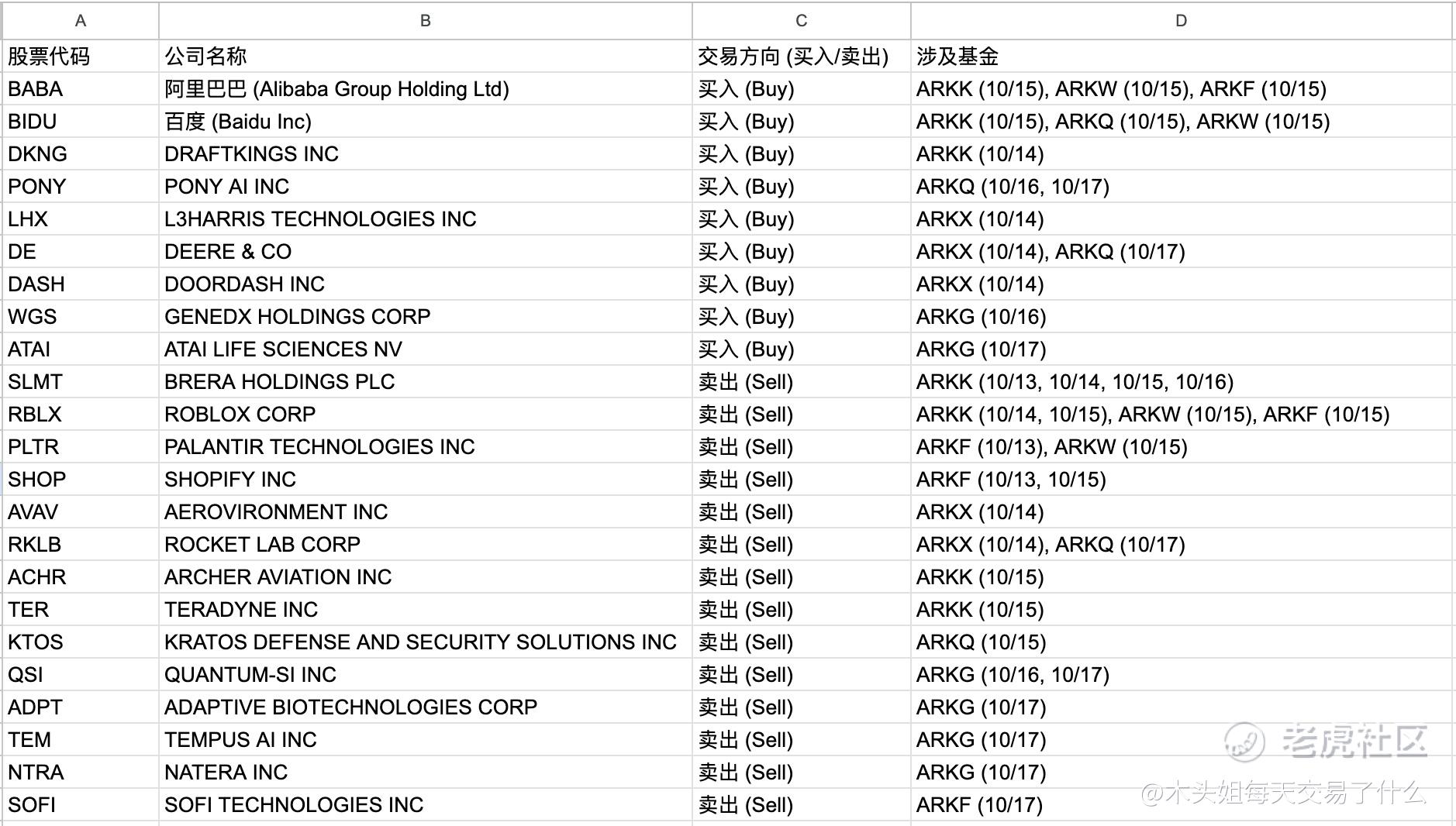 集中买入中概股: 10月15日,阿里巴巴和 百度再次被多个 ARK 基金(ARKK, ARKQ, ARKW, ARKF)同时大量买入。