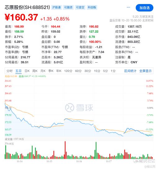 此前,受“并购”芯来科技消息影响,9月12日开盘后,芯原股份持续走高,午间收盘前即收获20CM涨停。然而收购逐点半导体却未能让其再现盛况,10月16日微涨后回落至前一日收盘水平。经历10月17日大跌6.84%后,今日,芯原股份微涨0.85%报160.37元/股,总市值843.09亿元。