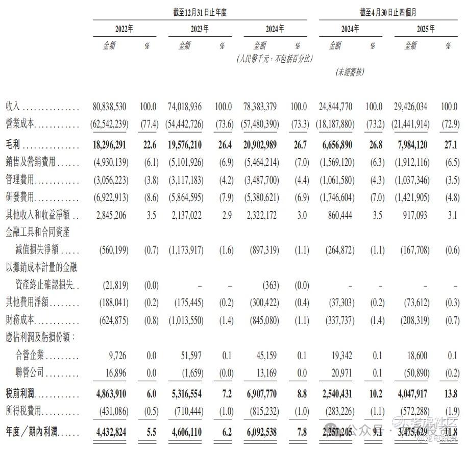 毛利:2022-2024年毛利分别为182.96亿元,195.76亿元和209.03亿元,2024年前4个月毛利66.56亿元,2025年前4个月毛利79.84亿元。