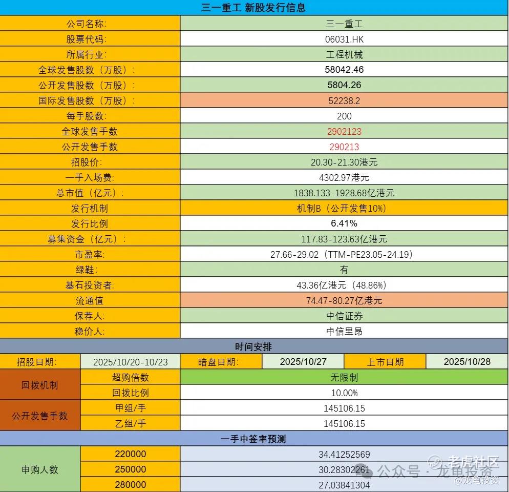 公司2003在于A股沪市主板上市,股票代码600031,相较其它知名公司,三一重工AH进度算晚了,今日三一重工A股收盘每股价格22.49元人民币,约合24.54,港股招股价20.30-21.30港元,则A/H溢价率为15.21%至20.89%;本次引入23位基石投资者,认购43.36亿港元,占比48.86%;保荐人由中信证券保荐,稳价人由中信里昂担任;话说中信保荐的中小票无敌,这种超大票有待考察。