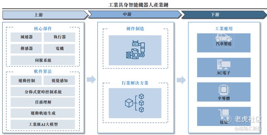产业链方面,工业具身智能机器人行业上游为减速器、传感器、电机、伺服系统等核心零部件,以及运动控制、视觉感知、任务理解、工业级AI大模型等软件算法供应商,参与者包括英伟达、**、寒武纪、绿的谐波、秦川机床、汇川技术、双环传动等。