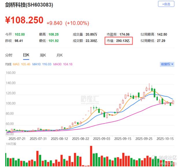 截至10月20日收盘,剑桥科技(603083.SH)A股的收盘股价为108.25元/股,市值为290亿元,港股发行价折价率约41.6%。