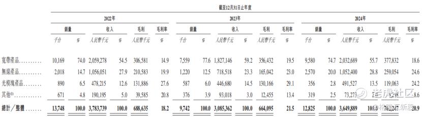 按产品线划分,宽带产品是公司的主要收入来源,报告期内收入占比分别为54.5%、59.2%、55.7%、58.6%。