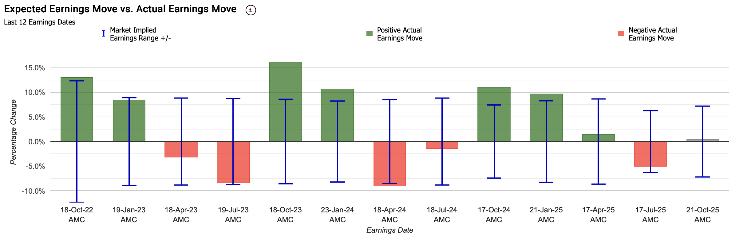 在过去 12 次业绩日中,期权市场有 50% 的时间高估了奈飞财报公布后的股价波动。财报发布后,市场平均预期的股价波动幅度为 ±8.6%,而实际的股价波动(绝对值计算)平均仅为 8.2%。