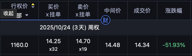 第二步,买入执行价为1160的看跌期权,支付1434权利金,限定下行风险。