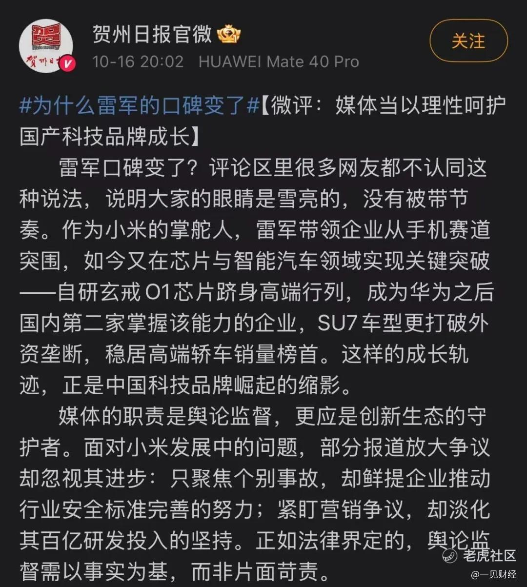 10月17日,该媒体再发表“理性声援国产科技,为何能引发网友共鸣?”的微评称,雷军与小米的口碑并非“变了”,而是在自研芯片、高端汽车等硬核突破中持续积累正向价值。