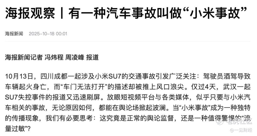 除了《贺州日报》,《大众日报》旗下的海报新闻10月18日发布“有一种汽车事故叫做‘小米事故’”一文指出,当下对小米汽车事故的报道与传播,似乎正在偏离理性轨道——每起事故不论责任在人还是在车,先被贴上“小米事故”的标签广泛传播;具体原因尚在调查,各种猜测已然满天飞。这种“特殊待遇”,显然已超出了正常监督的范畴。