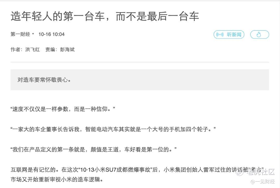 10月16日,《第一财经》发表题为“小米,别让年轻人的第一台车变成最后一台”评论称,在首款量产车正式上市至今一年半的市场考验下,“营销鬼才”雷军风评迎来了彻底的反噬。