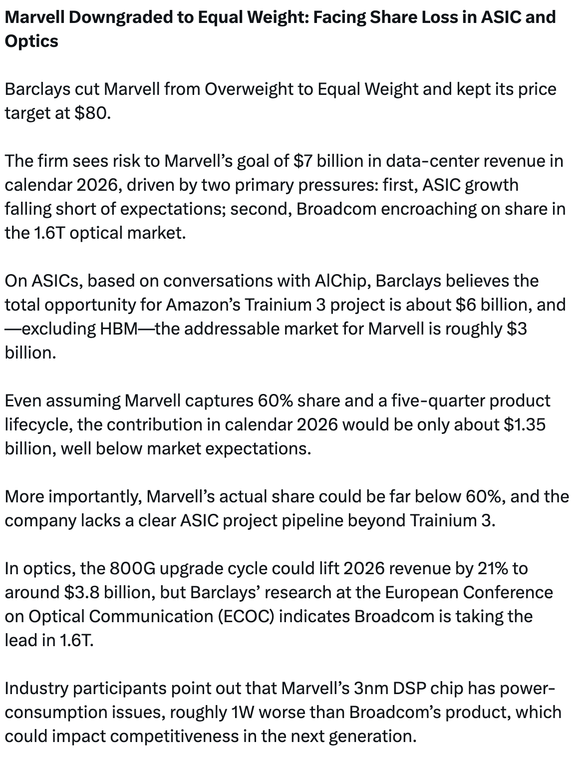 Barclays 将 $迈威尔科技(MRVL)$ 的评级从“增持(Overweight)”下调至“持有(Equal Weight)”,但维持其目标价为80 美元,反映出机构对其增长潜力的担忧,但仍认可其当前估值水平。
