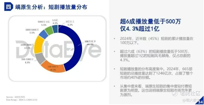 去年45%的短剧播放量在百万以下,71.5%的短剧播放量在千万以下。抖音原生短剧播放量破亿的短剧占比仅4.3%。