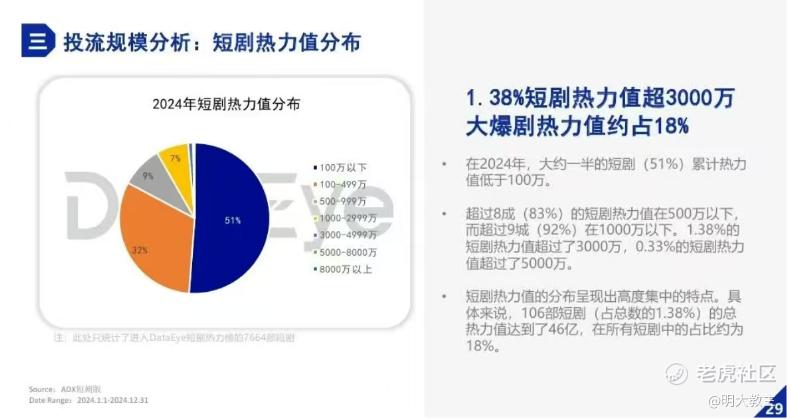 DateEye发布的《2024年短剧行业白皮书》显示,去年只有8%的短剧热力值破千万。头部1.38%的爆剧热力值占比高达18%,头部效应明显。