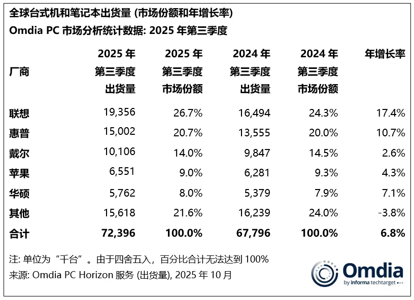 咨询机构Omdia(原Canalys)公布的最新研究显示,2025年第三季度,台式机、笔记本及工作站的总出货量同比增长6.8%,达到7200万台。要说报告中最亮眼的出货厂商,无疑是联想——出货量同比增长17.4%达1940万台!增速甩开惠普(10.7%)、戴尔(2.6%)等竞争对手,进一步巩固全球第一宝座。这不仅是短期数据利好,更揭示了三个关键投资价值:
