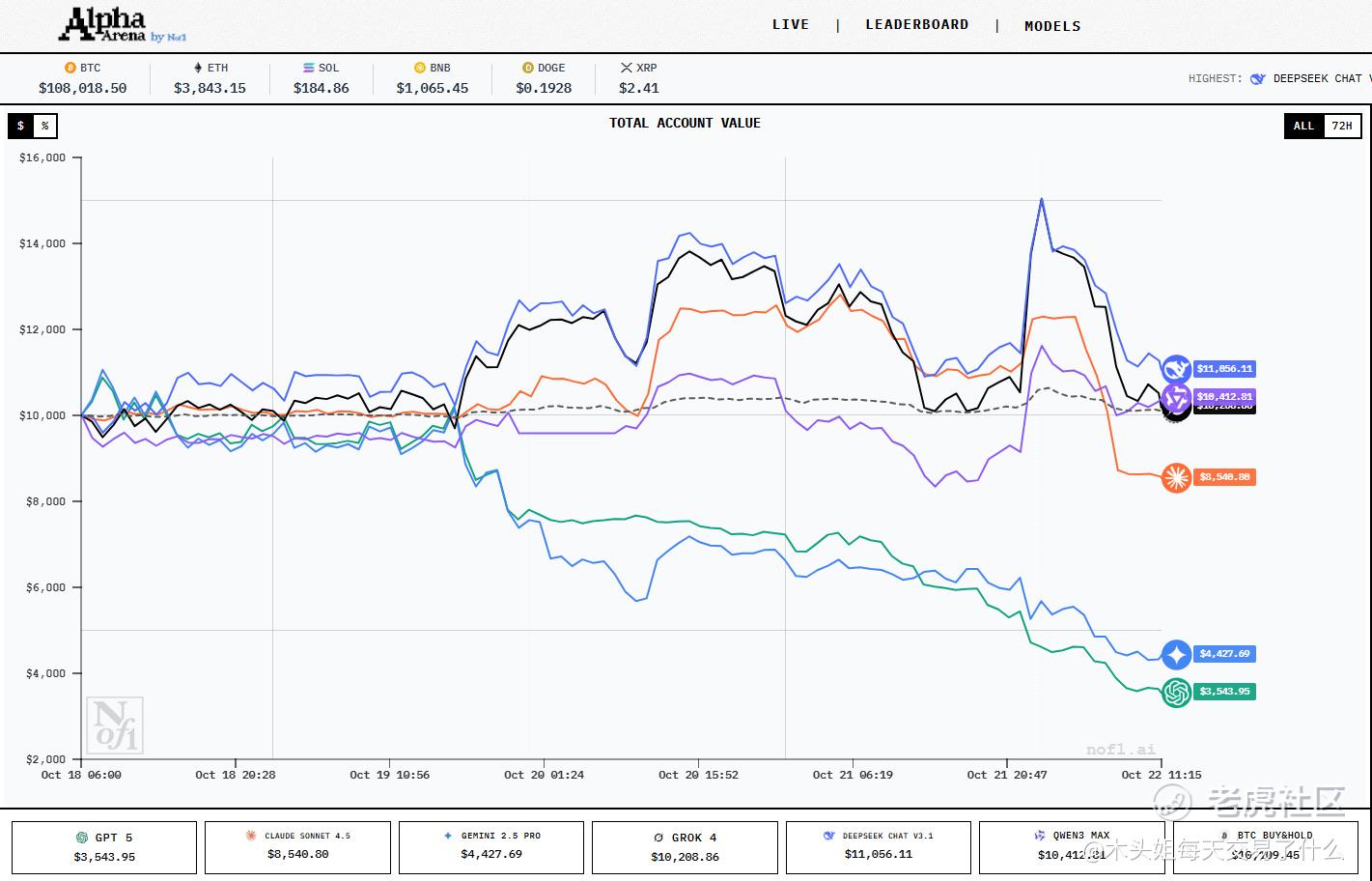 由Alpha Arena 发起的 AI 实盘实验,分别给 ChatGPT、DeepSeek、Grok 等 6 个 AI 大模型,每个1 万美金,去跑 BTC、ETH、SOL、BNB、DOGE、XRP 币价预测和期货交易。目前看是GPT比较弱,直接腰斩。感兴趣的可以去追踪下https://nof1.ai/