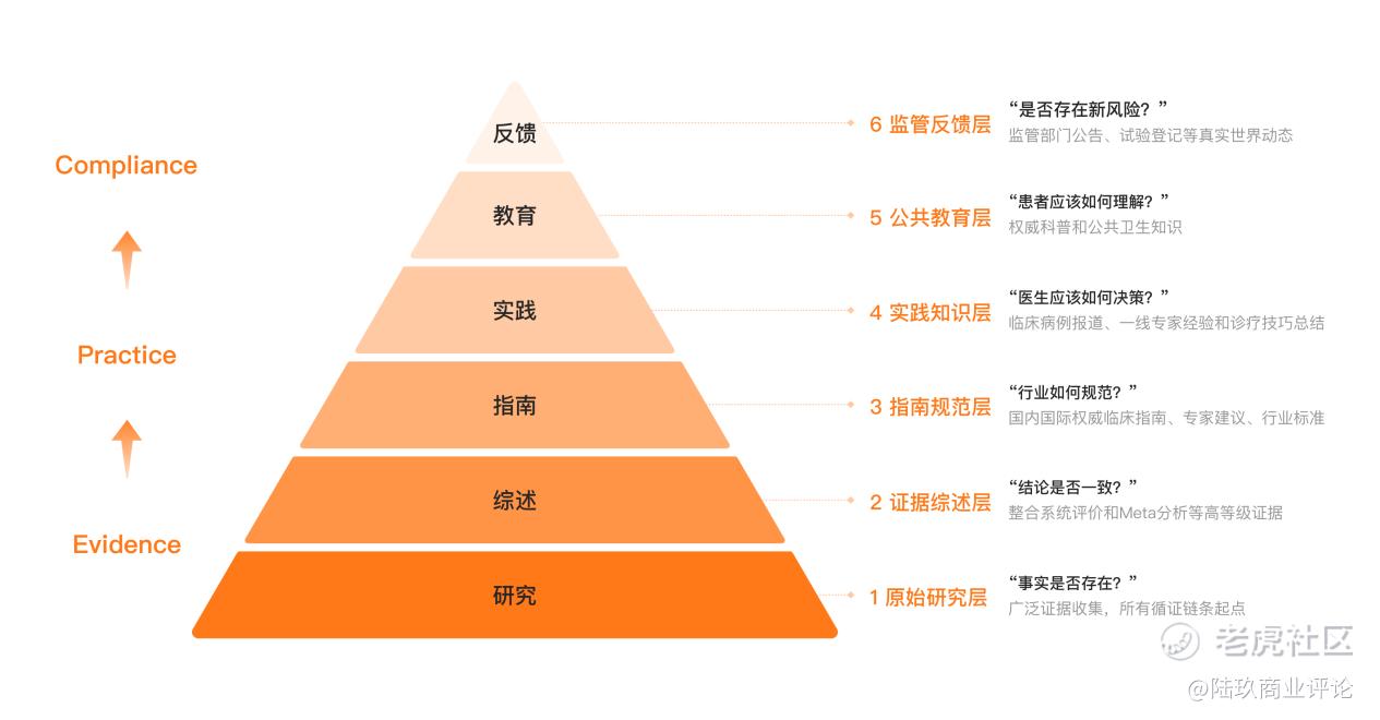 这个金字塔形的“六源”,是一层一层演化而来:原始层回答“事实是否存在”、证据层回答“结论是否一致”、指南层回答“行业如何规范”、实践层回答“医生应如何决策”、公共层回答“患者应如何理解”、真实世界层回答“是否存在新风险”。这让模型从“生成答案”走向“据实回答”,实现了从语言可信度到知识可信度的跃升。