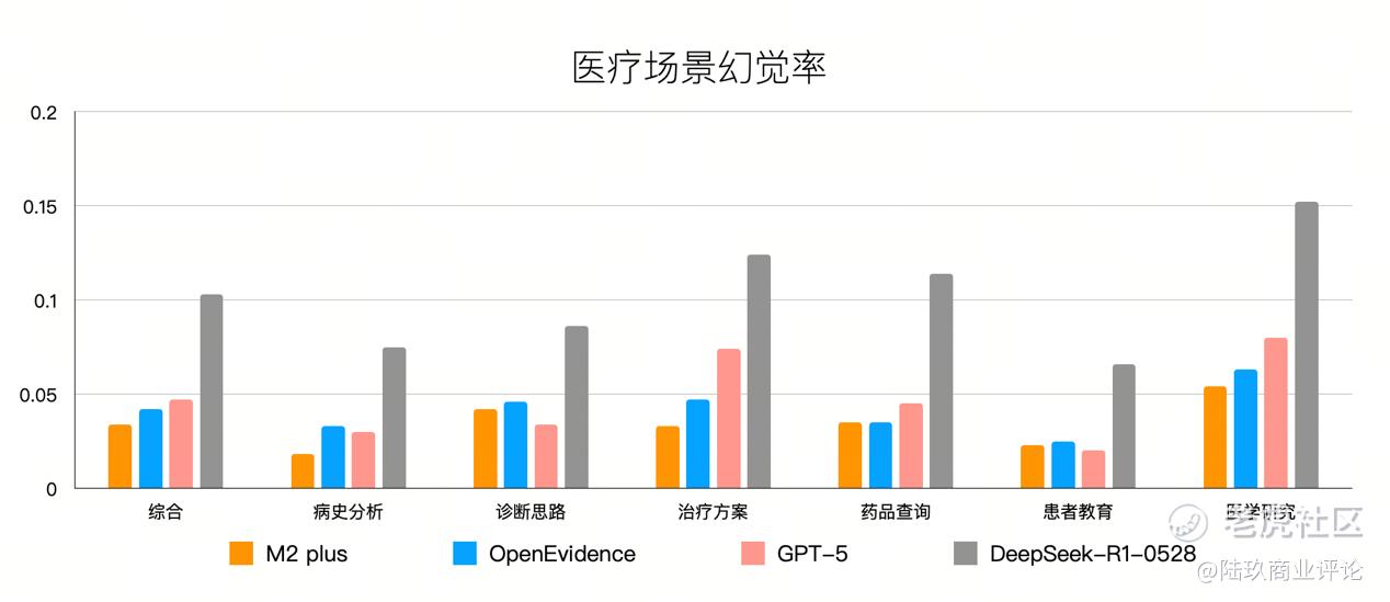 这种“循证驱动”的生成逻辑,让M2 Plus几乎杜绝了无中生有的内容。在多场景评测中,其综合幻觉率在所有大模型当中最低,相较DeepSeek R1最新版降低3倍,显著领先OpenEvidence。不仅如此,在病史分析、诊断思路、治疗方案等真实复杂的核心医疗场景中,达到了与人类资深临床专家同等的可信度。