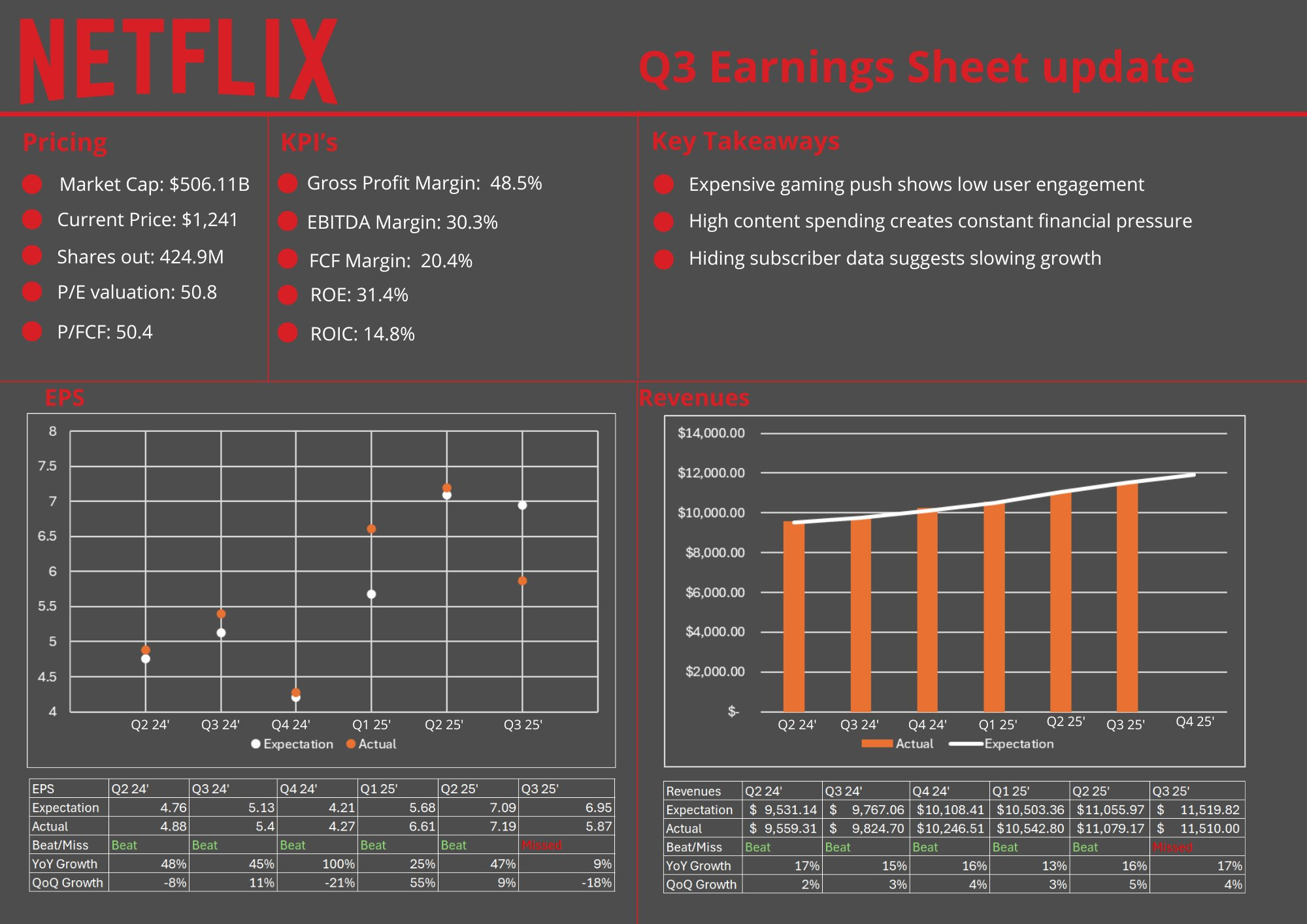 Netflix 2025Q3财报看似“爆冷”——净利润、EPS 双双远不及预期,盘后股价一度跌超7%,但核心矛盾并非业务失速,而是巴西税务一次性支出的意外冲击。